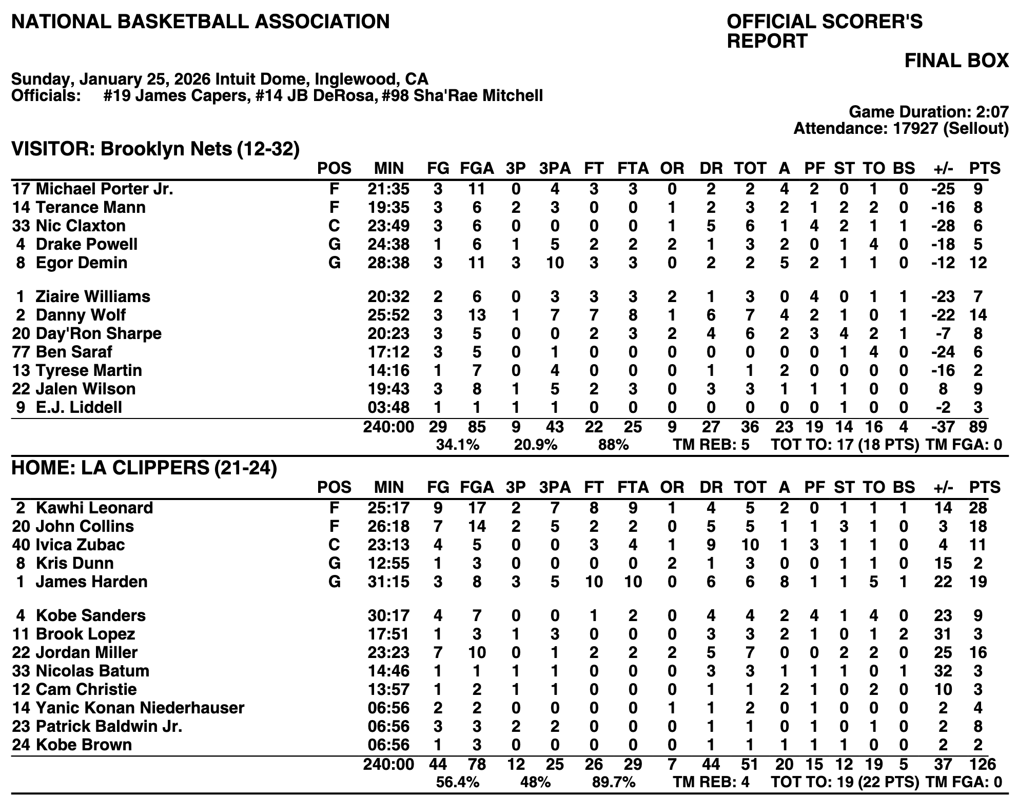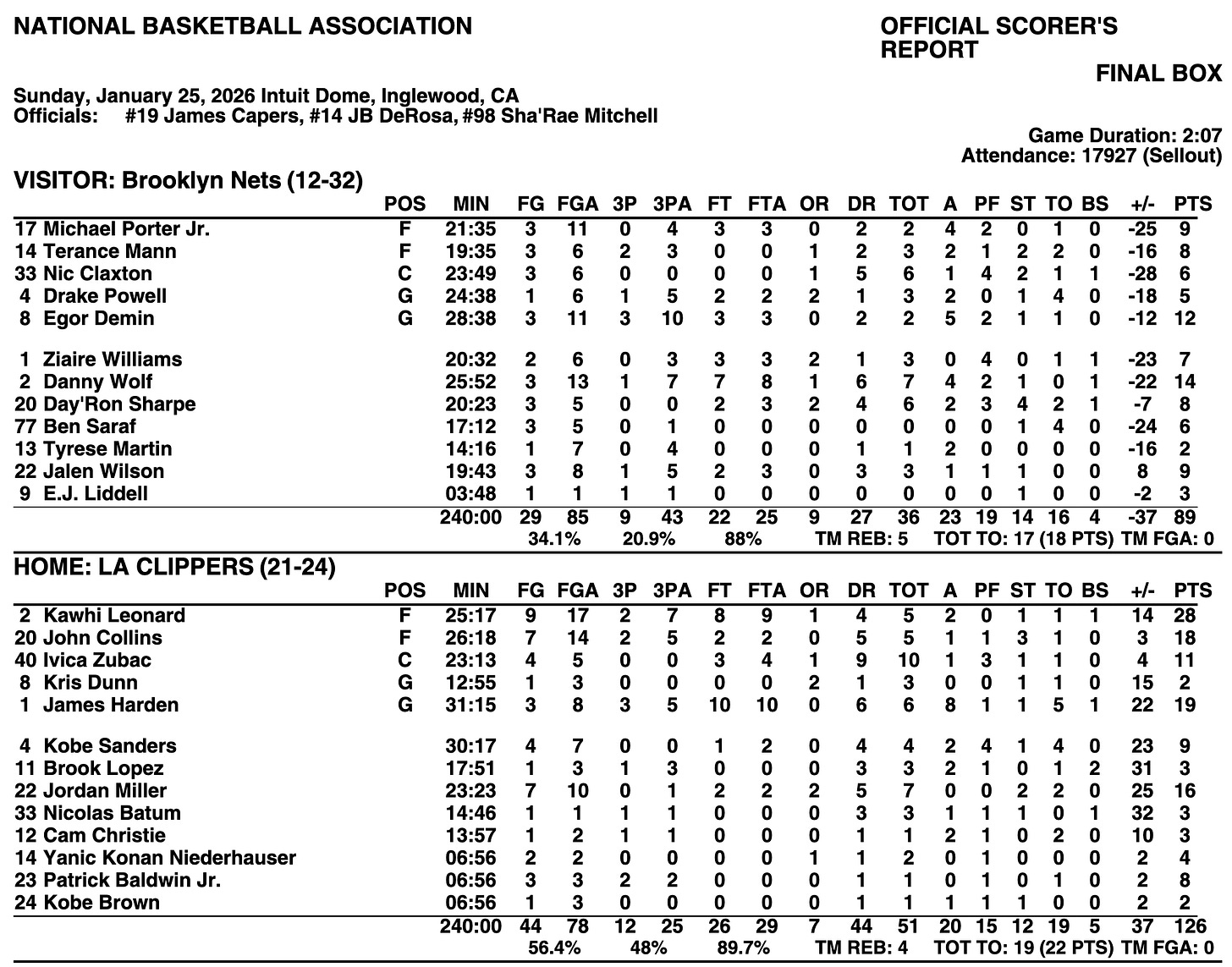 The Nets, who were fresh off a double-overtime game on Friday and then had to travel from Brooklyn to Los Angeles, were overwhelmed in the first quarter as the Clippers raced out to a 38-14 lead at the end of the opening frame. It only grew from there, with the Clippers leading by as much as 38 in the first half and 40 in the second.